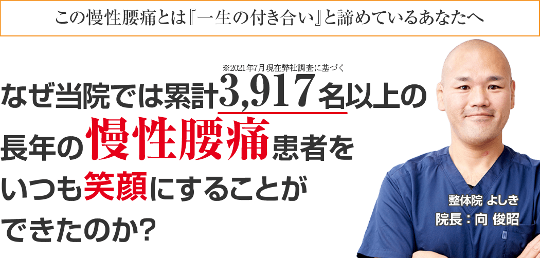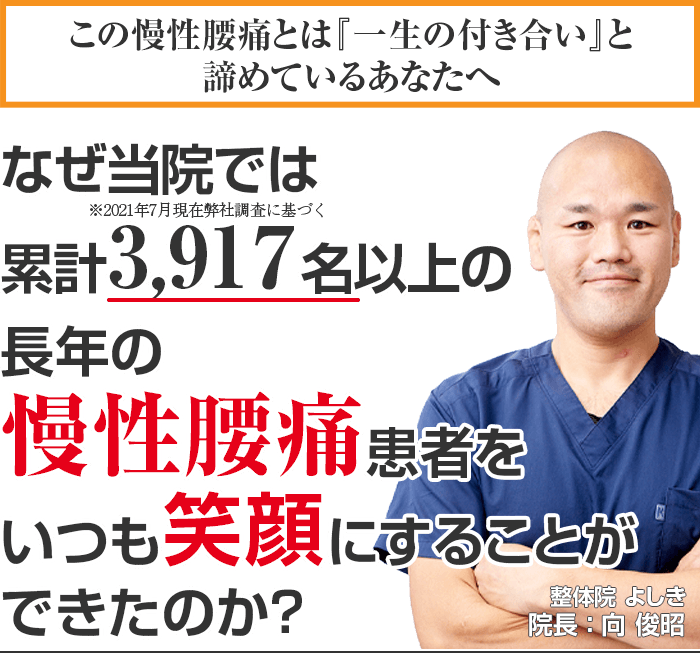 もし、あなたが今、上記のようにお悩みなら、心のどこかでほんの少しでも良くなりたい! と思われているなら、その辛い腰痛を整体院よしきに来院し、根本改善しませんか?