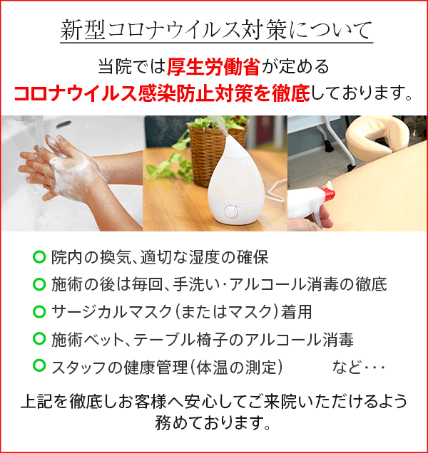 当院は完全予約制となります。予約時間の5分前にお越しください。ご予約前後の時間も他のお客様がいらっしゃいますので万が一遅れる場合はご連絡ください。またその場合は施術時間が短くなる場合がございます。
