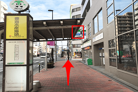 1バス停を降りましたら右方向(スーパーマーケット方向)へ進みます。