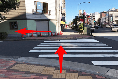 2最初の交差点を左へ渡り、横断歩道を右に渡ります。