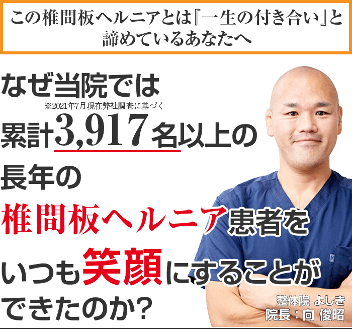 もし、あなたが今、上記のようにお悩みなら、心のどこかでほんの少しでも良くなりたい! と思われているなら、その辛い椎間板ヘルニアを整体院よしきに来院し、根本改善しませんか?