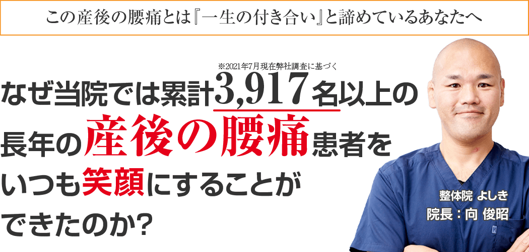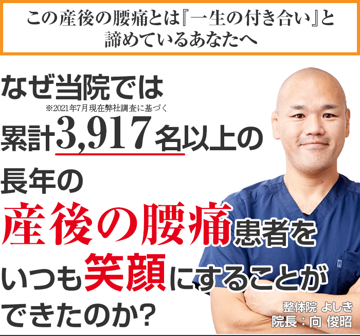 もし、あなたが今、上記のようにお悩みなら、心のどこかでほんの少しでも良くなりたい! と思われているなら、その辛い産後の腰痛を整体院よしきに来院し、根本改善しませんか?