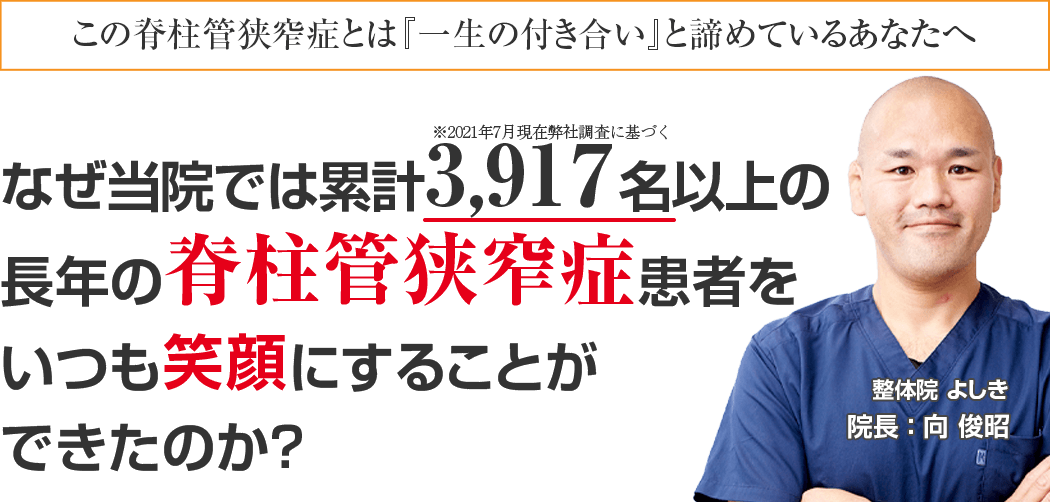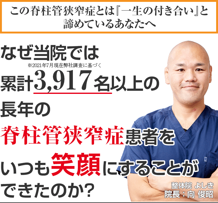 もし、あなたが今、上記のようにお悩みなら、心のどこかでほんの少しでも良くなりたい! と思われているなら、その辛い脊柱管狭窄症を整体院よしきに来院し、根本改善しませんか?