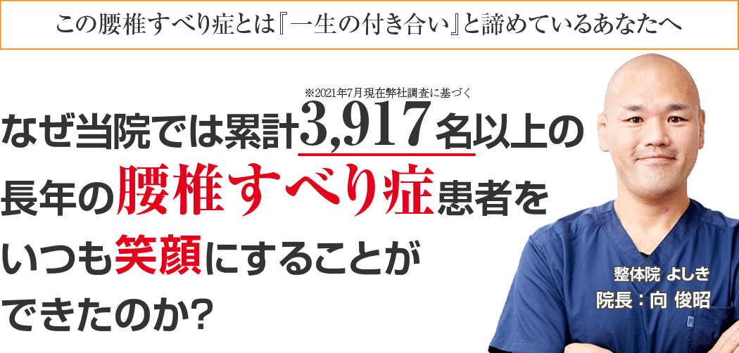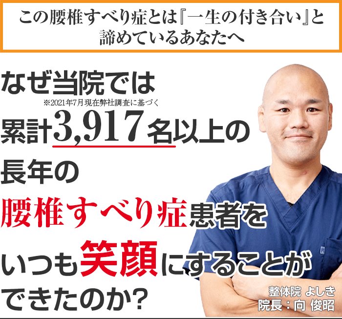 もし、あなたが今、上記のようにお悩みなら、心のどこかでほんの少しでも良くなりたい! と思われているなら、その辛い腰椎すべり症を整体院よしきに来院し、根本改善しませんか?
